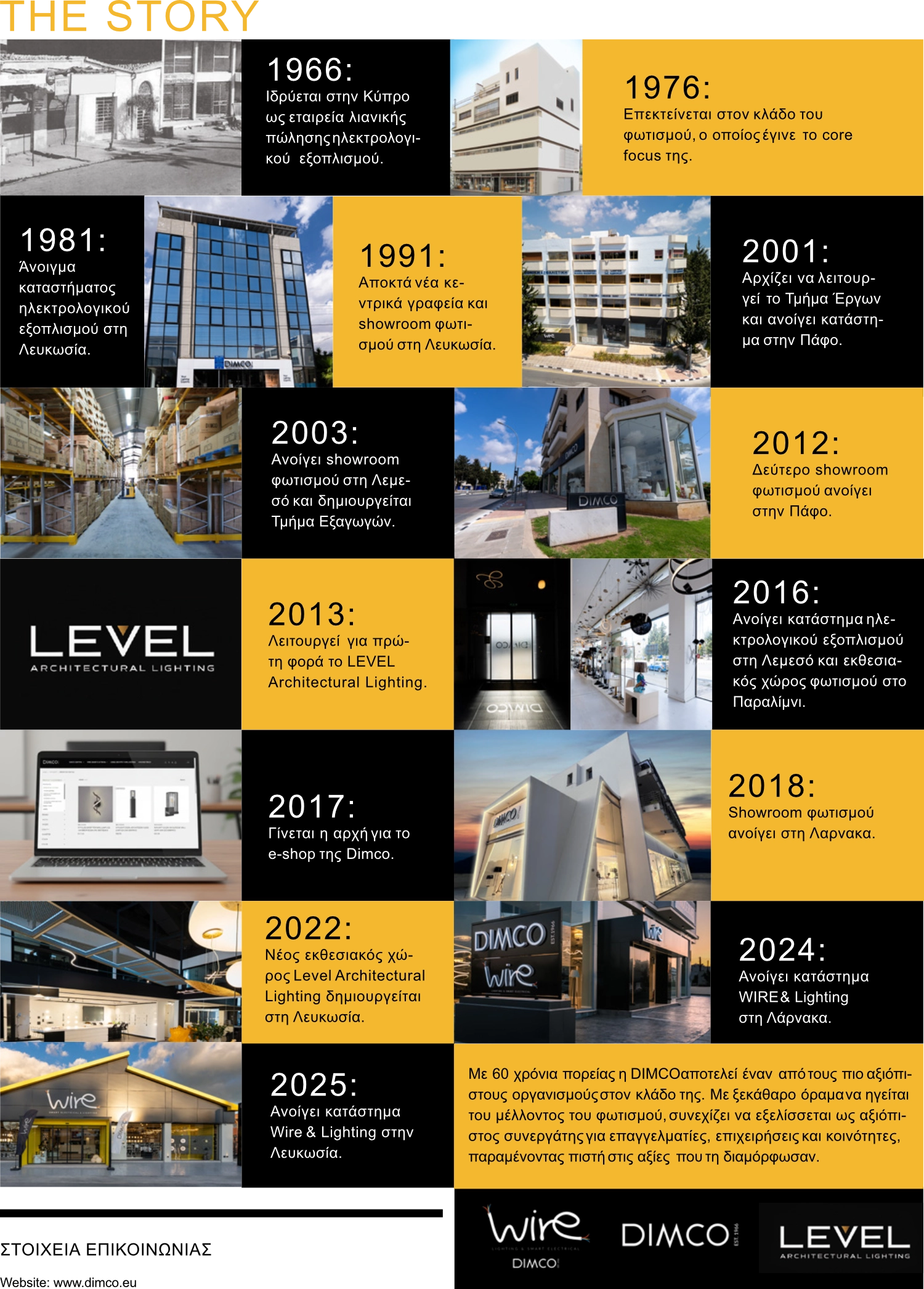 Σήμερα η DIMCO εισάγει, διανέμει και διαθέτει λιανικά ένα ευρύ φάσμα προϊόντων φωτισμού και ηλεκτρολογικού εξοπλισμού, εξυπηρετώντας οικιστικούς, εμπορικούς και βιομηχανικούς χώρους. Διατηρεί 12 καταστήματα σε όλη την Κύπρο, ένα πλήρως ενοποιημένο e-shop και υποστηρίζει επαγγελματίες μέσω του WIRE division, καθώς και αρχιτεκτονικά έργα φωτισμού μέσω του LEVEL Architectural Lighting.